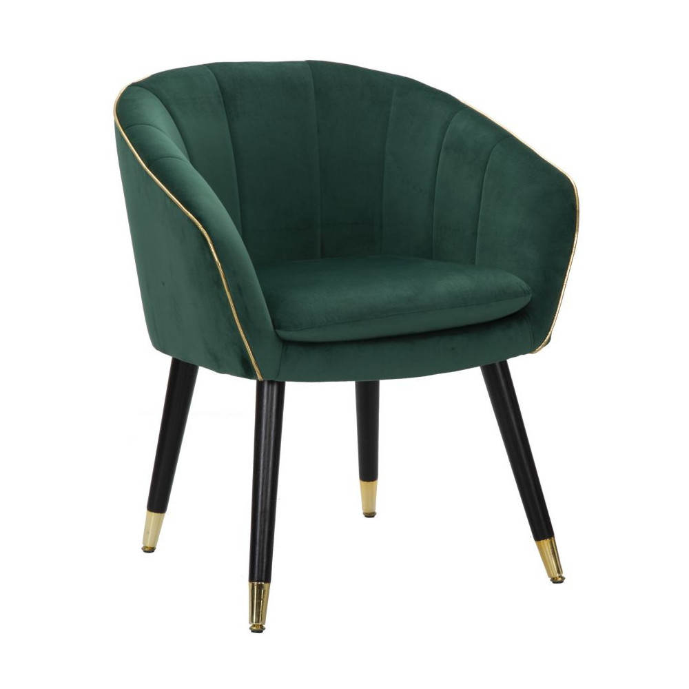 Poltrona in tessuto verde imbottito con rifiniture dorate e gambe in legno nero con dettagli in oro. L'eleganza del tessuto e dell'oro unite per offrire un comodo relax.