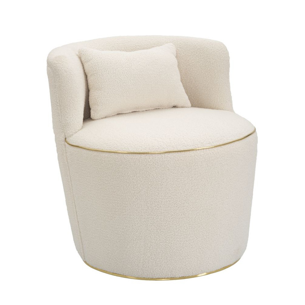 Elegante poltroncina rotonda in tessuto imbottito con schienale, dalle linee semplici ed essenziali e impreziosita da decorazioni dorate. Completa di cuscino.