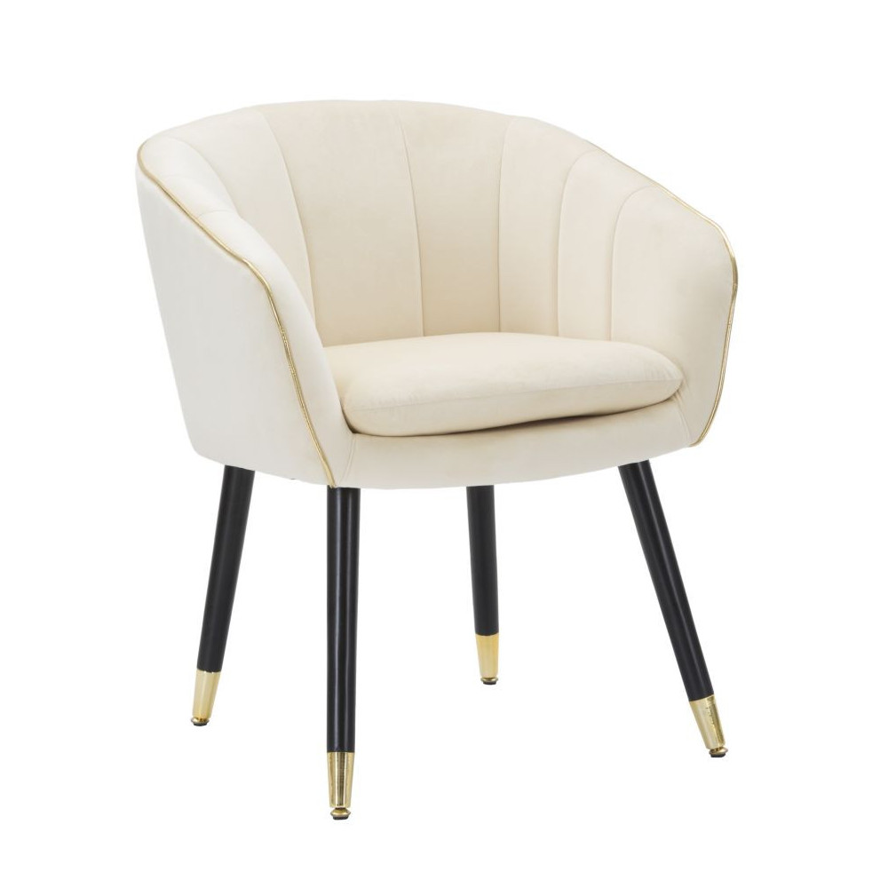 Poltrona in tessuto color crema imbottito con rifiniture dorate e gambe in legno nero con dettagli in oro. L'eleganza del tessuto e dell'oro unite per offrire un comodo relax.