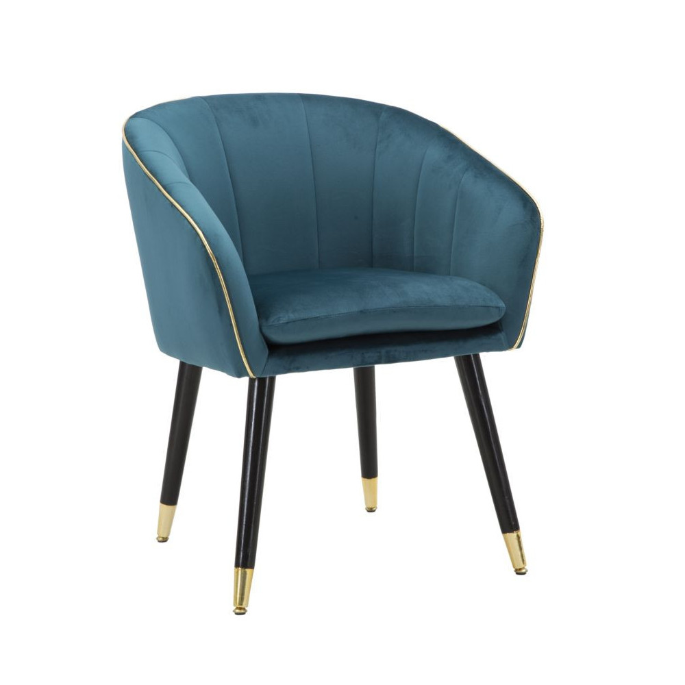 Poltrona in tessuto color ottanio imbottito con rifiniture dorate e gambe in legno nero con dettagli in oro. L'eleganza del tessuto e dell'oro unite per offrire un comodo relax.