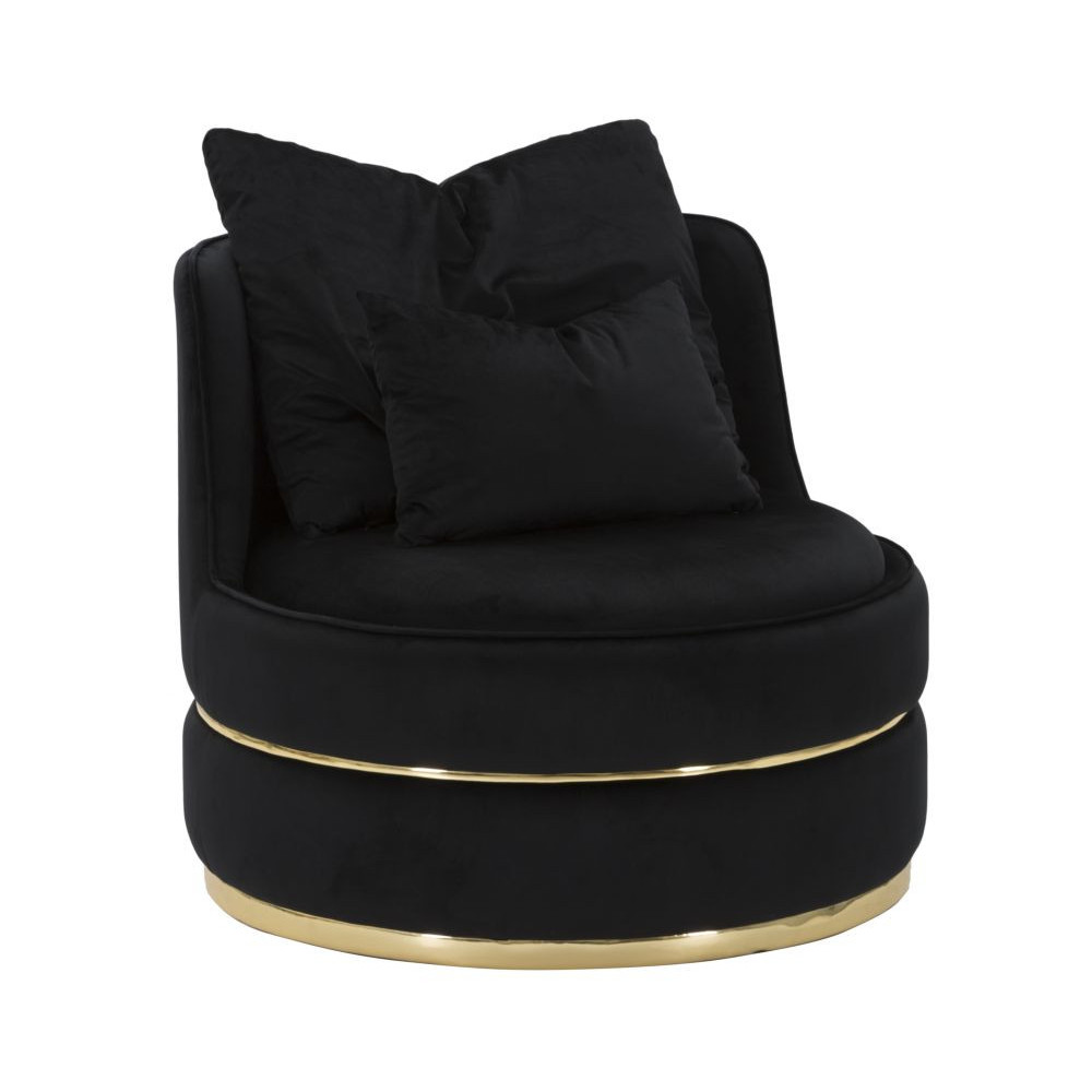 Elegante ed originale poltrona in tessuto imbottito nero. Due decori dorati per tutta la circonferenza donano un tocco di classe all'oggetto. La poltrona è completa di 2 cuscini.