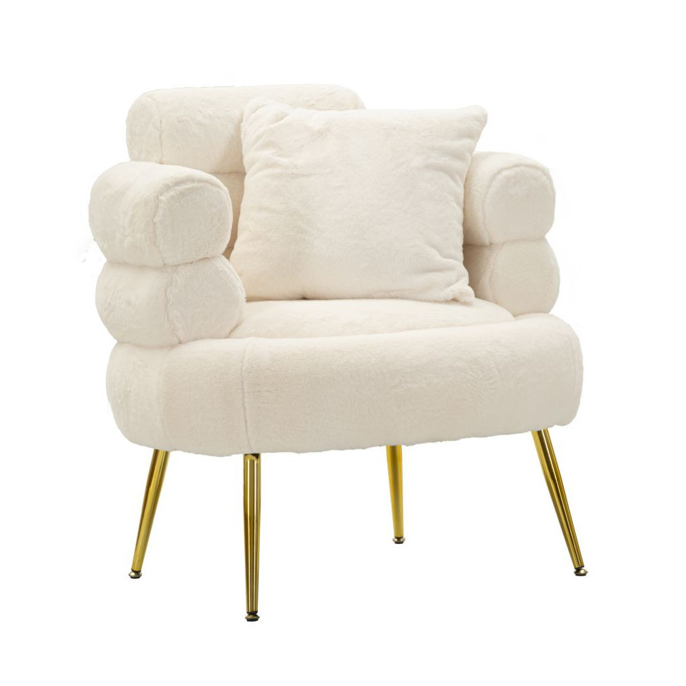Poltrona bianca con poggiatesta e gambe dorate da assemblare, rivestita in morbida pelliccia sintetica. Ideale per ambienti moderni e raffinati, aggiunge un tocco di lusso e comfort.