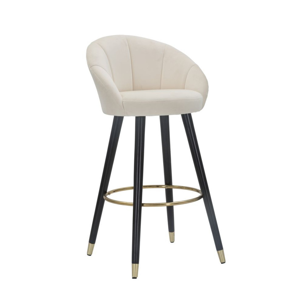 Sgabello bar in velluto imbottito color crema con gambe in legno e poggiapiedi circolare e decorazioni delle gambe in metallo dorato che donano un tocco di eleganza e ricercatezza.
