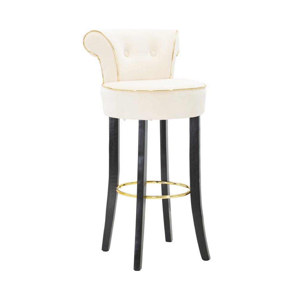 Sgabello bar rotondo imbottito in velluto sintetico con schienale con poggiapiedi in metallo dorato. La forma semplice e le linee essenziali lo rendono perfetto per essere combinato a qualsiasi tipo di arredo.