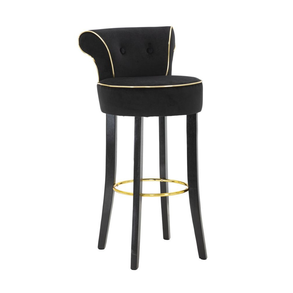 Sgabello bar rotondo imbottito in velluto sintetico con schienale con poggiapiedi in metallo dorato. La forma semplice e le linee essenziali lo rendono perfetto per essere combinato a qualsiasi tipo di arredo.