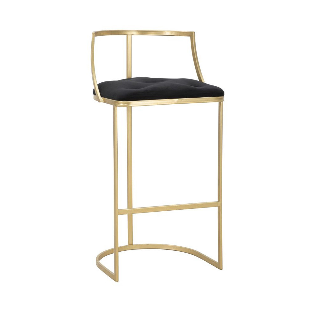 Sgabello bar in metallo dorato con schienale. La seduta è realizzata con velluto sintetico imbottito. Le linee semplici e geometriche lo rendono perfetto per ogni tipologia di arredamento.