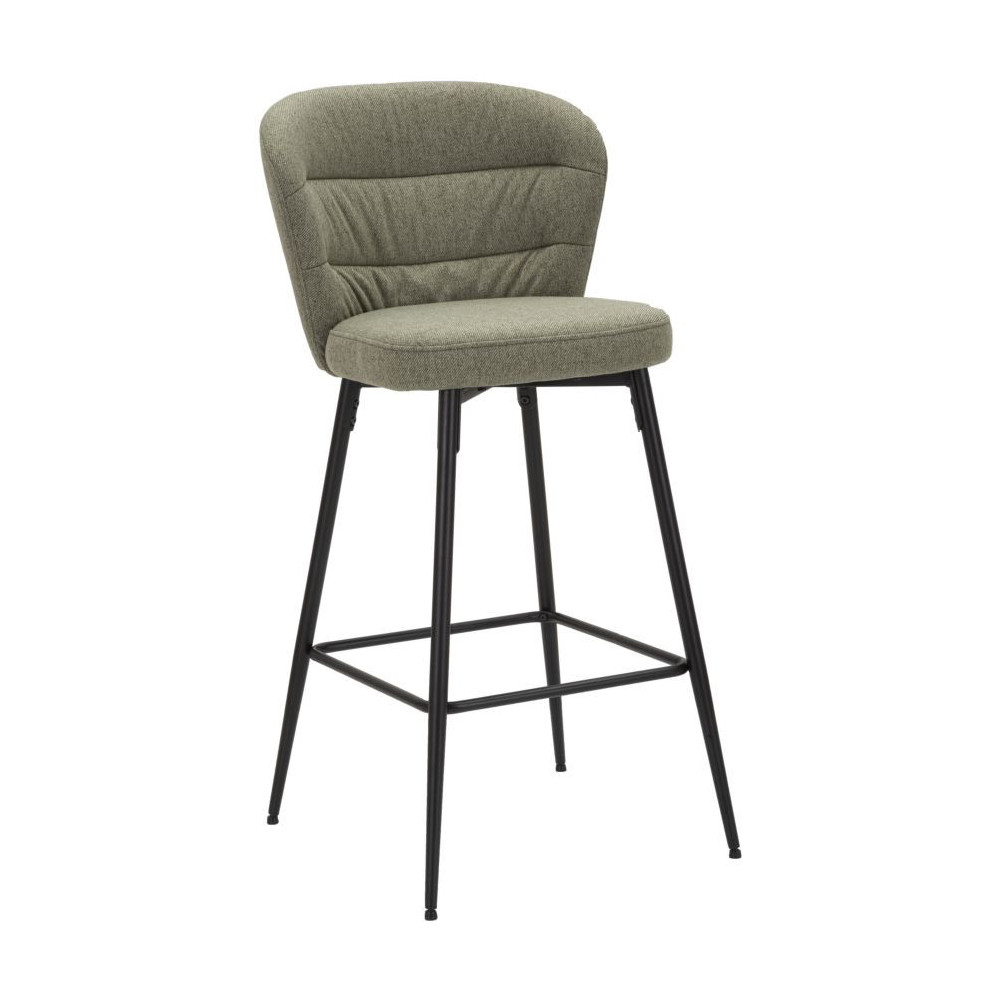 Set di 2 sgabelli bar in tessuto imbottito dalle linee che rimandano al design anni 70. Il tessuto insieme alle gambe e al poggiapiedi in metallo nero donano un tocco di classe ad ogni ambiente.