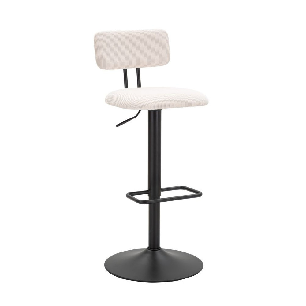 Sgabello bar rotondo girevole in metallo e tessuto imbottito con schienale imbottito. Completo di regolatore d'altezza. Il design semplice richiama gli anni '70.