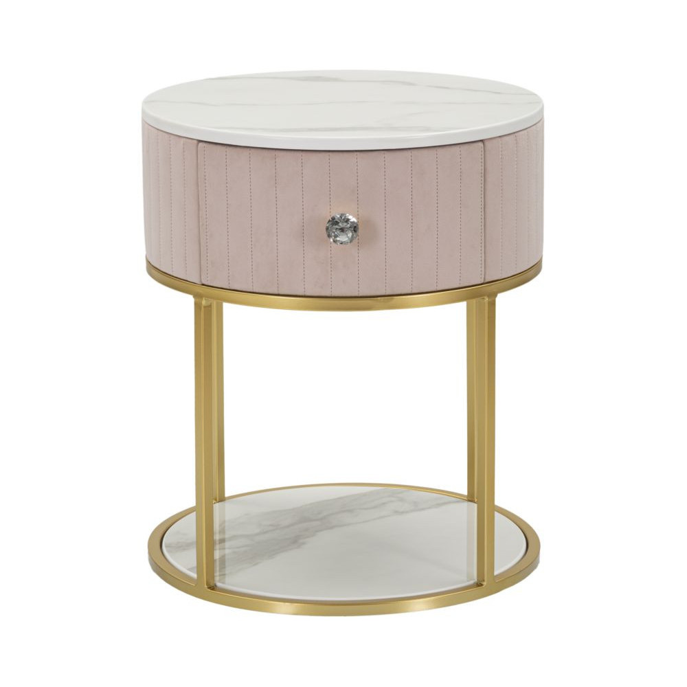 Comodino rotondo con struttura in metallo dorato con top e ripiano in simil marmo e cassetto. La parte superiore è rivestita in tessuto imbottito rosa.
