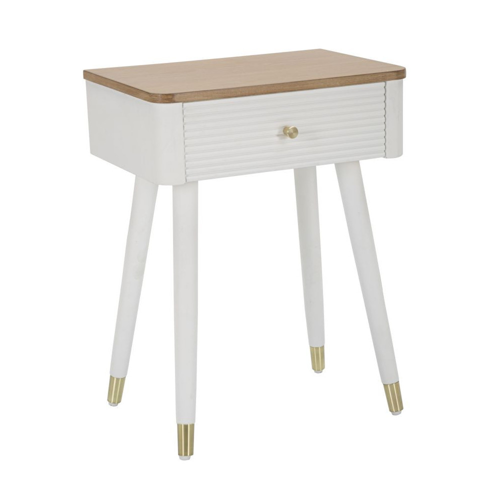 Comodino in legno bianco dalle linee semplici ed essenziali. Completo di cassetto e piano in legno marrone. La maniglia e i piedini in metallo dorato donano un tocco di classe.