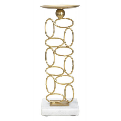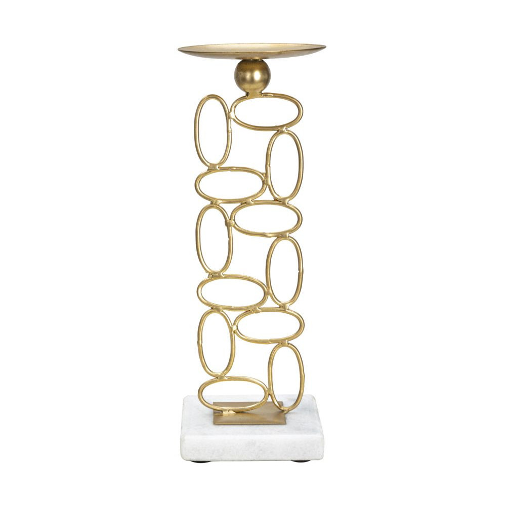 Portacandele in metallo dorato con base in marmo bianco dal design lineare e geometrico e dalle linee morbide e sinuose.