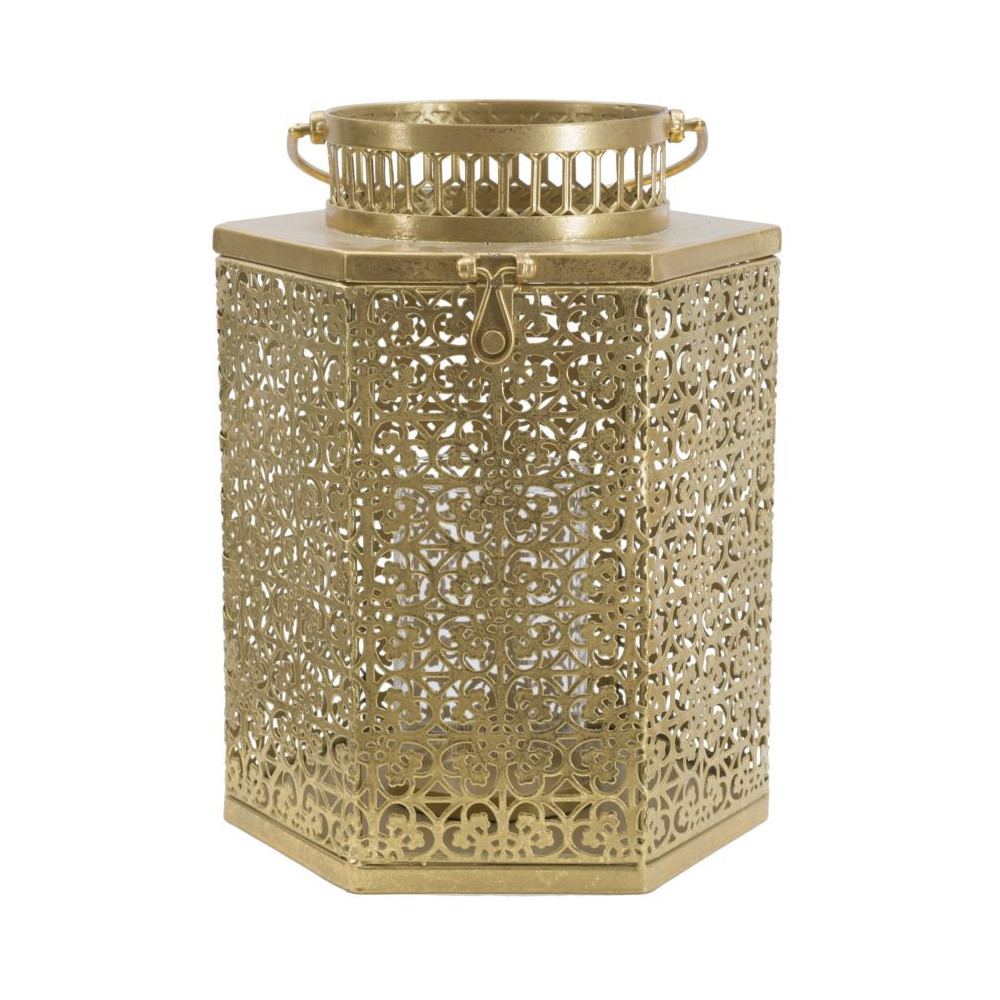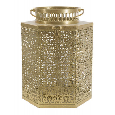 Elegante lanterna con manico in metallo dorato. I particolari intagli, illuminati da una candela rendono magico ogni ambiente.