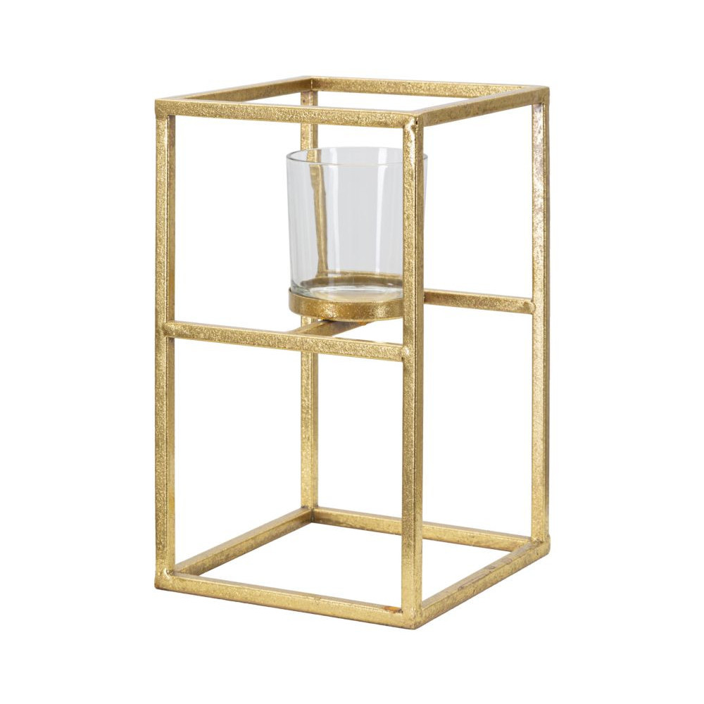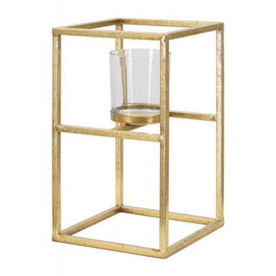 Portacandele in metallo dorato con bicchierino in vetro dalla struttura geometricamente squadrata e lineare.