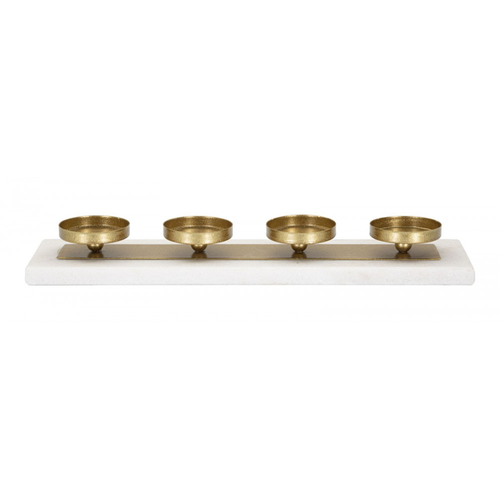 Portacandele rettangolare in metallo dorato con base in marmo bianco dalla linea semplice ed essenziale. Può contenere 4 candele.