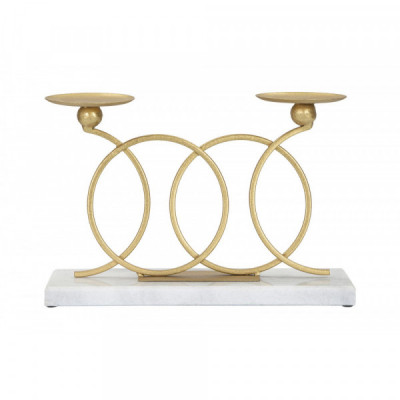 Portacandele in metallo dorato con base in marmo bianco. La struttura geometrica è composta da cerchi e semicerchi che si intersecano tra loro. Può contenere 2 candele.