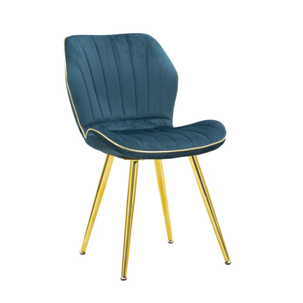 Coppia di sedie imbottite in velluto sintetico color ottanio complete di comodo schienale. Le rifiniture dorate donano un tocco di luce e lo rendono un perfetto connubio tra eleganza e comodità.