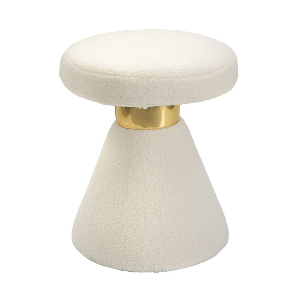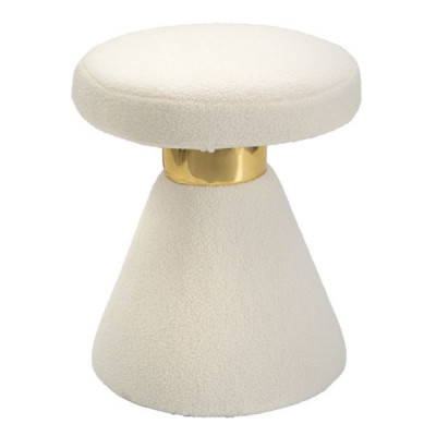 Tavolo da caffé rotondo in tessuto imbottito, dalle linee semplici e impreziosito da un'elegante decorazione dorata.