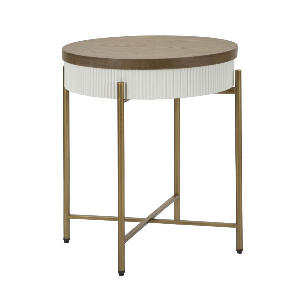 Tavolinetto rotondo in legno bianco e marrone finemente decorato con linee in rilievo. Prodotto da assemblare.