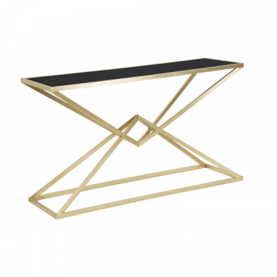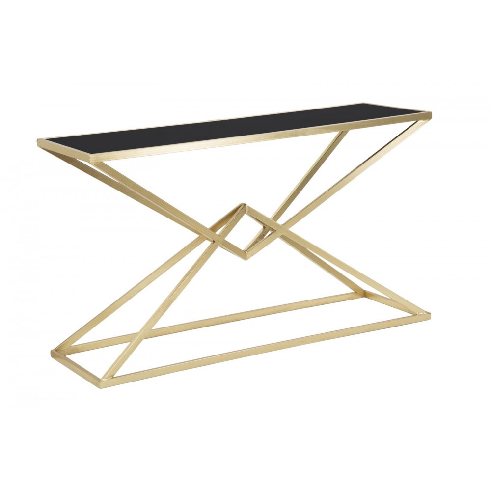 Console rettangolare in metallo dorato e vetro temprato nero dalle linee geometriche e ipnotiche. Il dorato abbinato al nero crea un forte impatto. Un elemento lussuoso e glam per la tua casa. Elementi d'arredo che ricordano i lussuosi ambienti dell'Hotel Plaza di New York. Ricrea l'atmosfera magica del Grande Gatsby nel tuo interior.