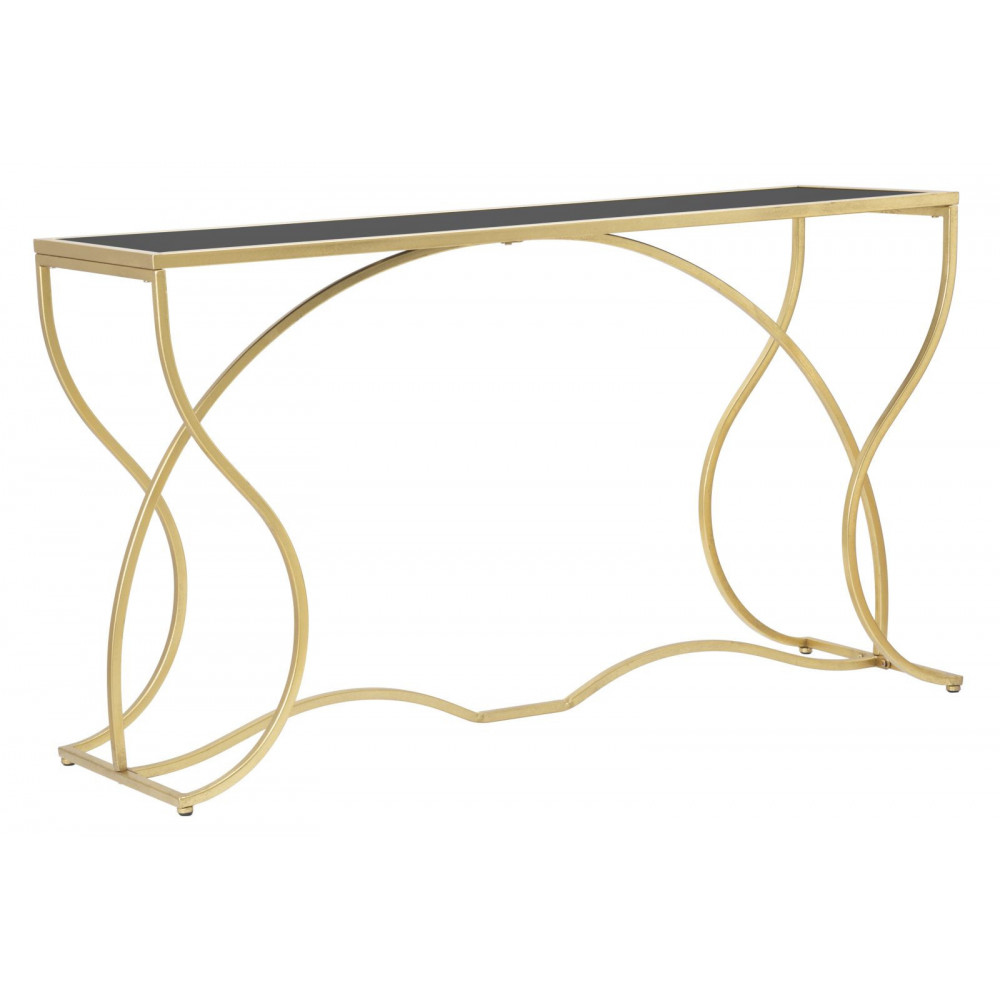Elegante console in metallo dorato con ripiano in vetro temprato nero dalle linee morbide e sinuose. Eleganza e design si fondono in linee uniche per rendere speciale ogni ambiente.