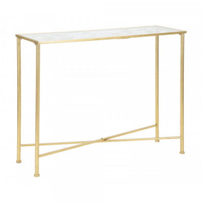 Console in metallo dorato con piano in vetro. Sotto il piano sono presenti delle elegantissime decorazioni a forma di farfalle. Le particolari decorazioni combinate con un design essenziale donano un tocco di classe ad ogni ambiente senza appesantire troppo l'insieme.