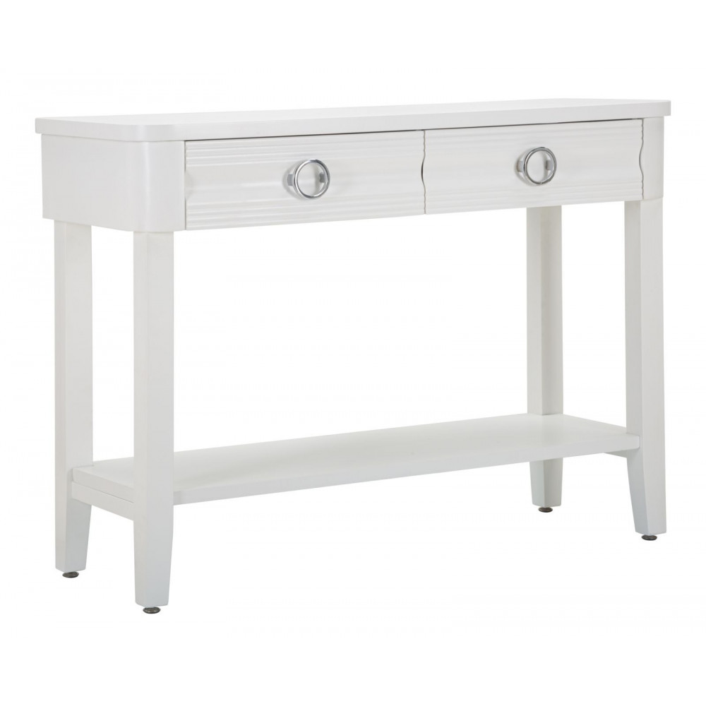 Console in legno bianco con 2 cassetti e ripiano dalla lavorazione semplice e dalle linee essenziali.