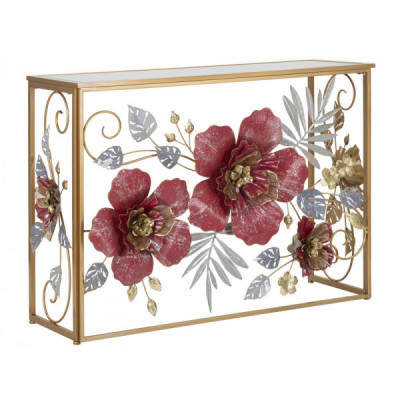 Console rettangolare in metallo dorato con foglie e fiori dai colori accesi decorativi e piano in vetro a specchio.