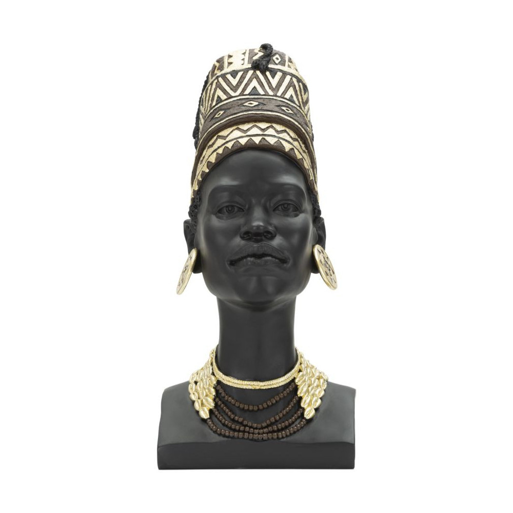 Statua a forma di testa di donna con copricapo e gioielli ispirati alla tradizione delle tribù primitive.