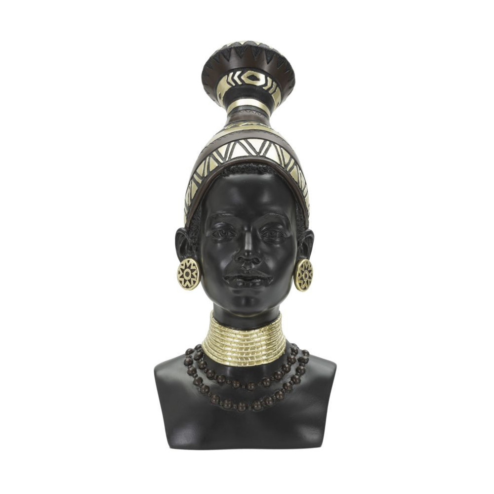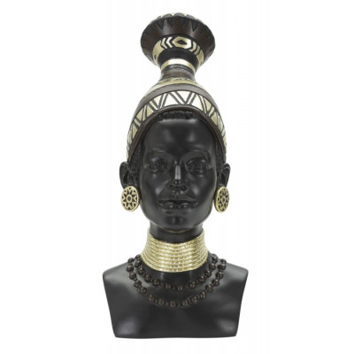 Statua a forma di testa di donna con copricapo e gioielli ispirati alla tradizione delle tribù primitive.