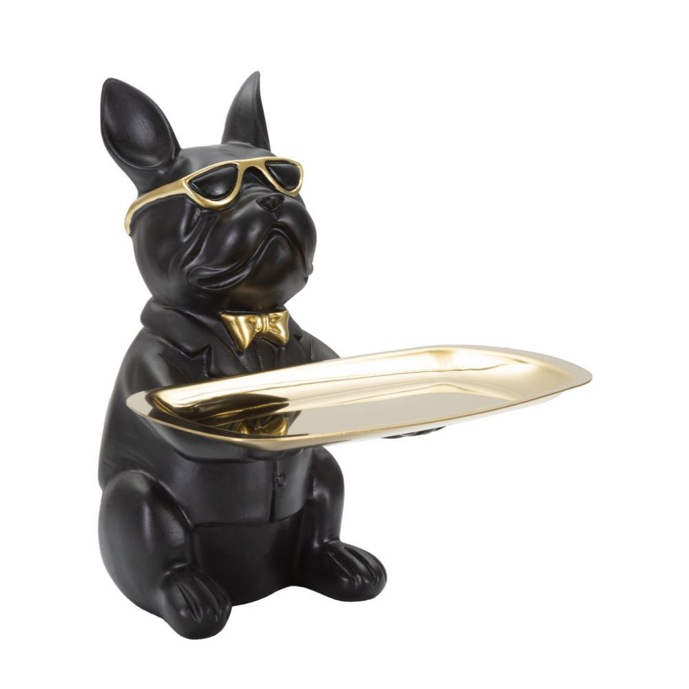 Simpatica statuetta a forma di cane dal design ispirato ai cartoon con occhiali da sole e papillon dorati con in mano un pratico vassoio anch'esso dorato che può essere utilizzato come porta oggetti.