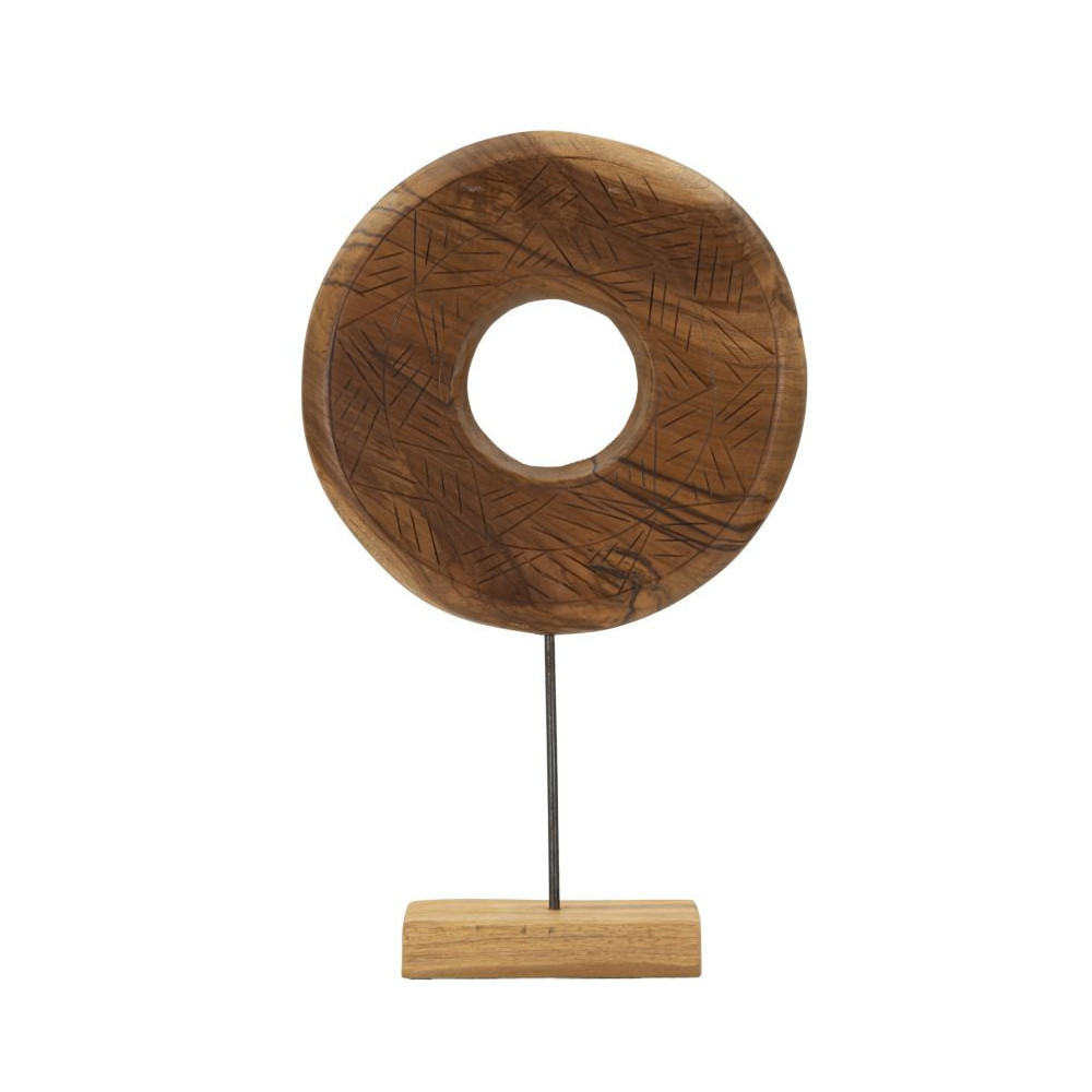 Scultura rotonda in teak riciclato, finemente intarsiata con motivi irregolari, esprime un'eleganza senza tempo. Ogni dettaglio, frutto di un'abilità artigianale impeccabile, trasmette una sensazione di calore e unicità, celebrando la bellezza del legno e la sua storia.