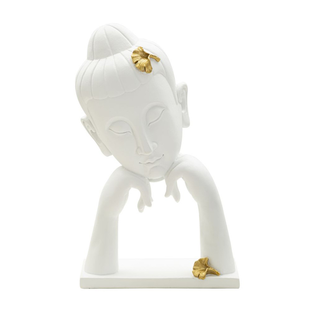 Elegante testa di buddha finemente decorata con foglie dorate.