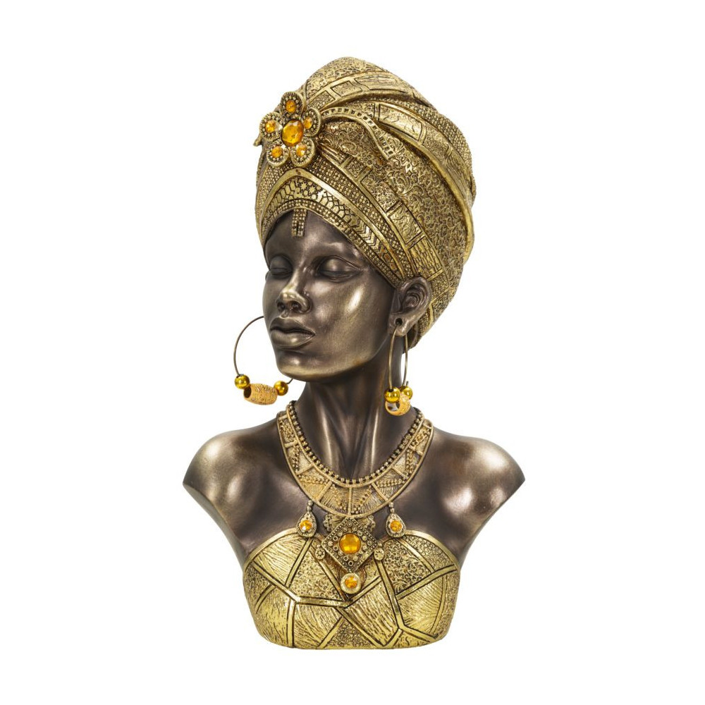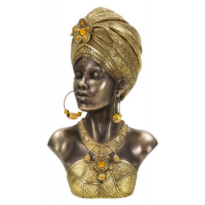 Busto di donna con turbante e vestiti che richiamano le tribù africane.