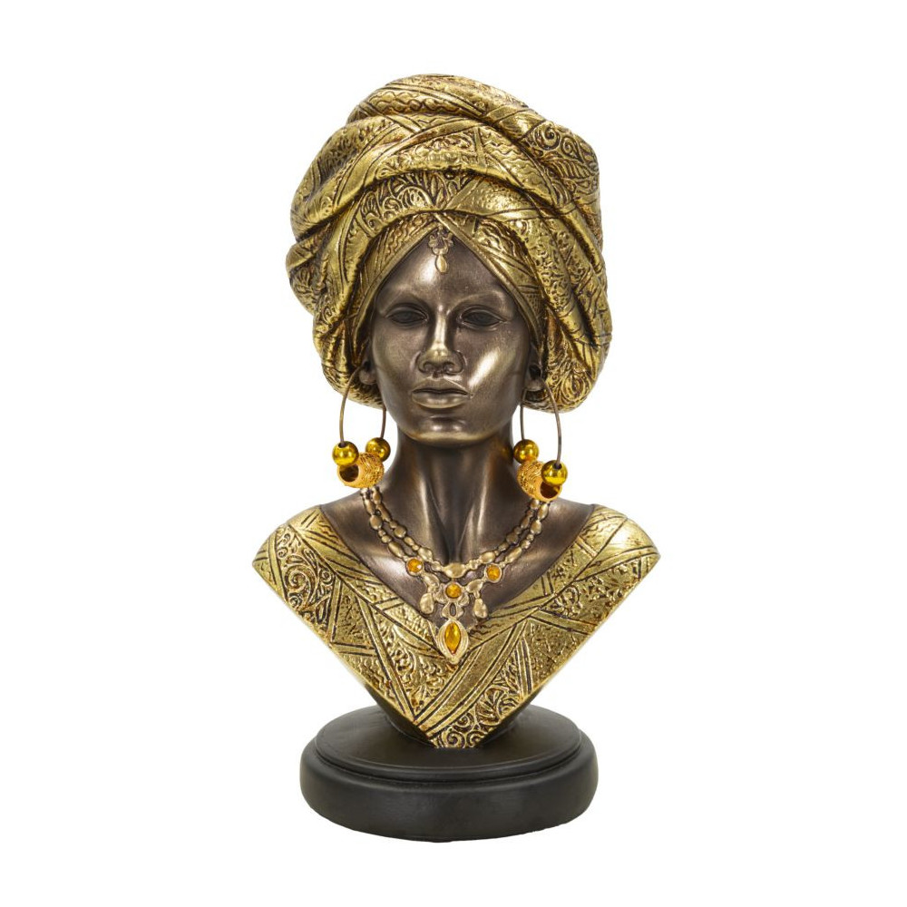 Busto di donna con turbante e vestiti che richiamano le tribù africane.