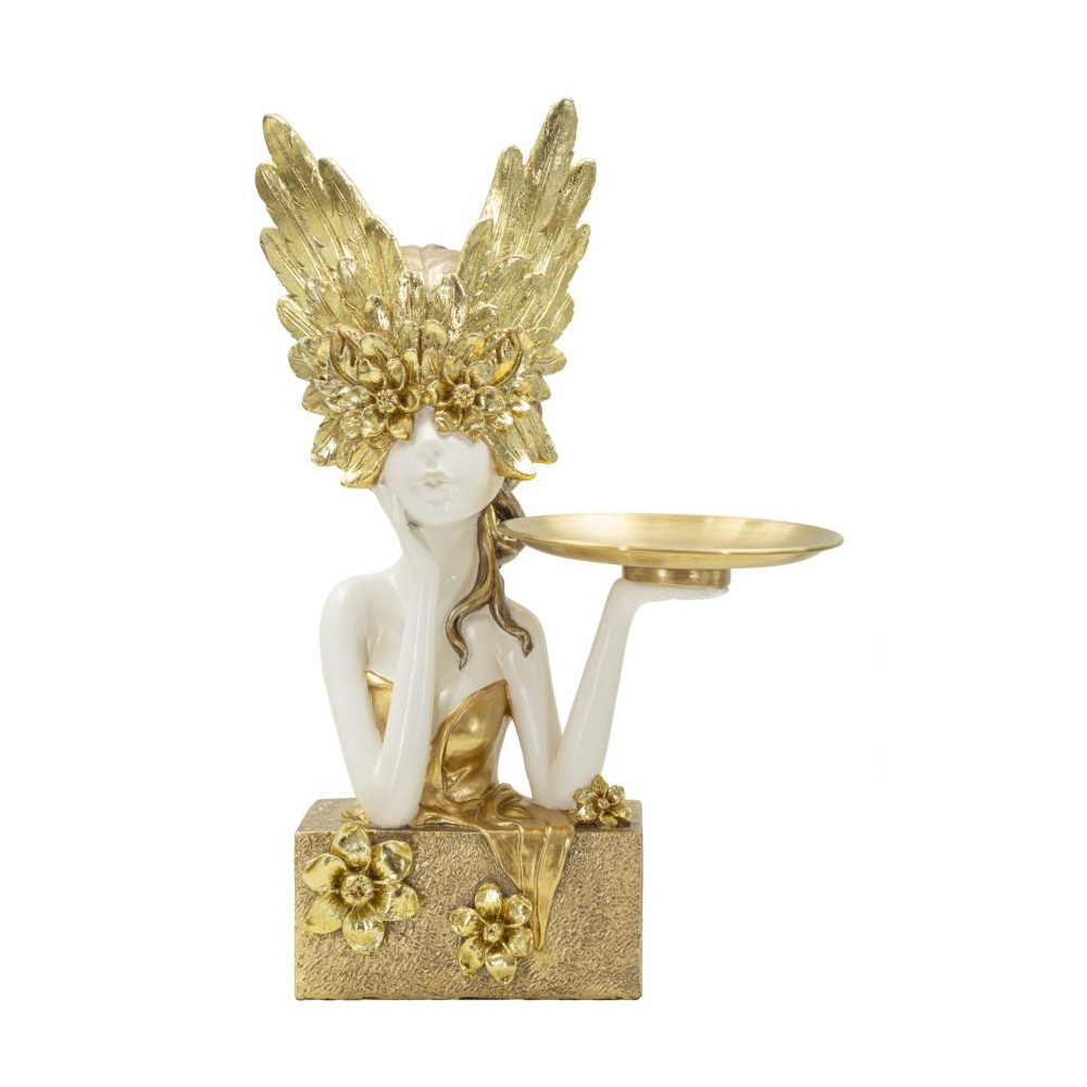 Scultura di busto di donna che richiama l'arte classica elegantemente decorata con ali e fiori dorati completa di pratico vassoio.