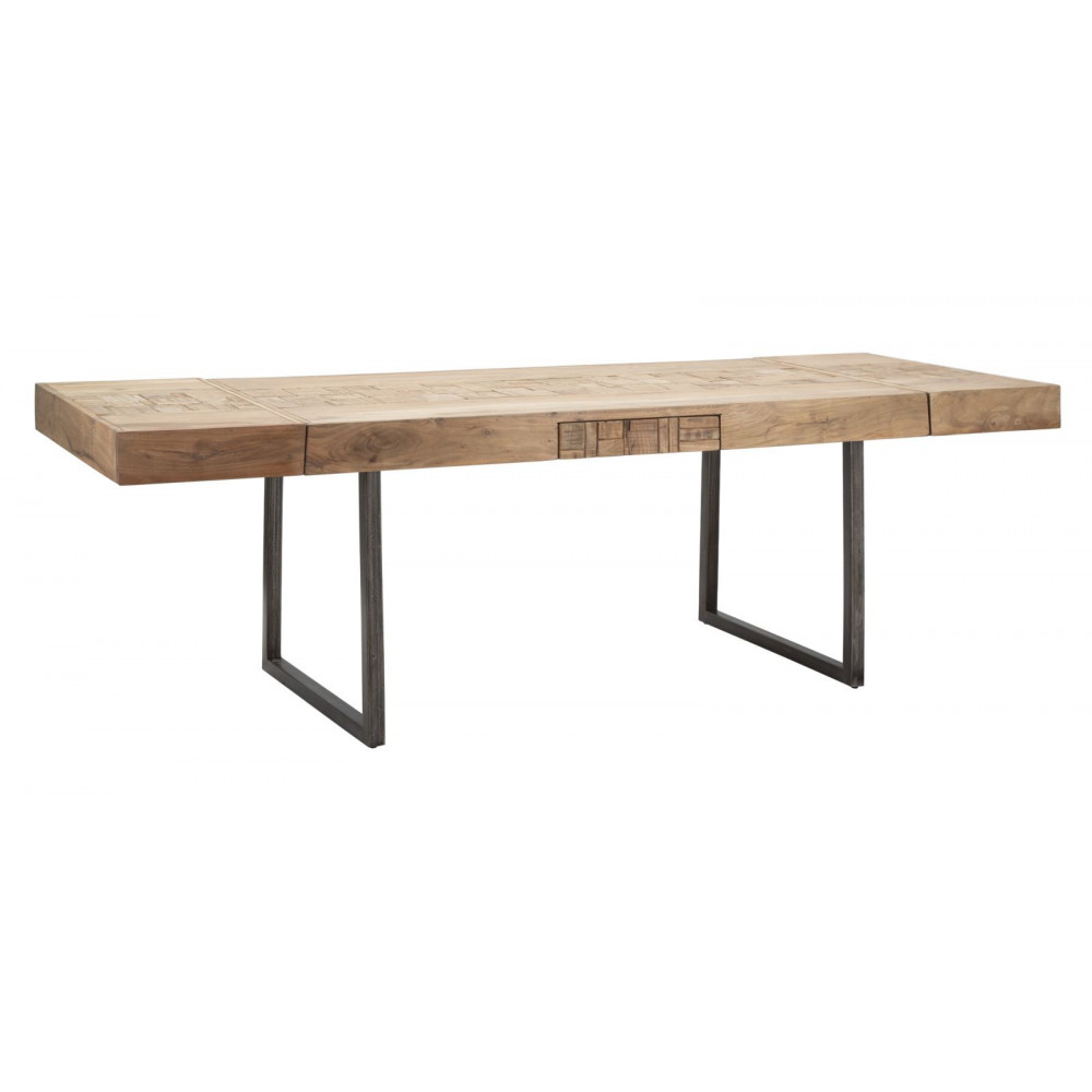 Tavolo da pranzo allungabile in legno con gambe in metallo. Lo stile industriale unito ai preziosi intarsi donano un tocco di eleganza e ricercatezza.