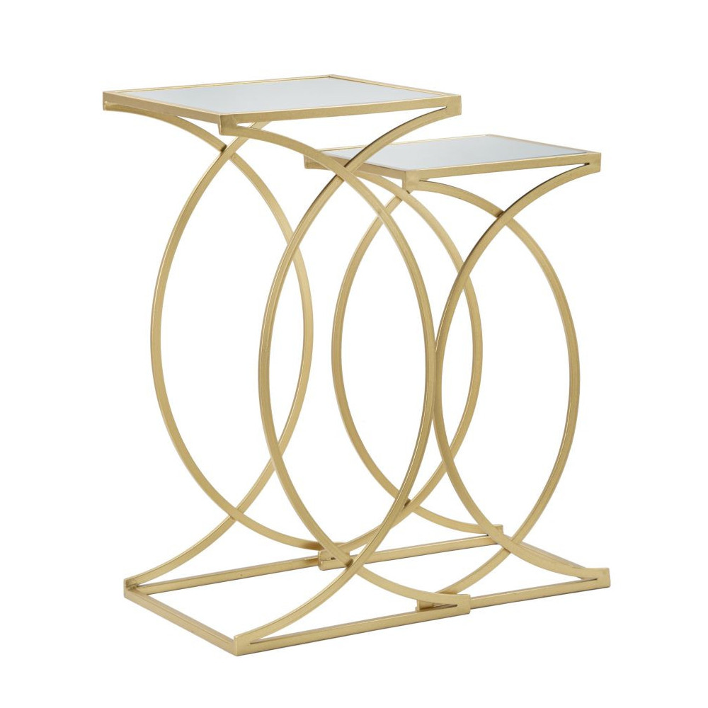 Elegante coppia di tavolinetti in metallo dorato con piano in vetro a specchio dalle linee morbide e sinuose. Il metallo color oro dona un tocco di classe ad ogni ad ogni ambiente glam. Le linee geometriche e arrotondate si sposano perfettamente con ogni tipo di arredo.