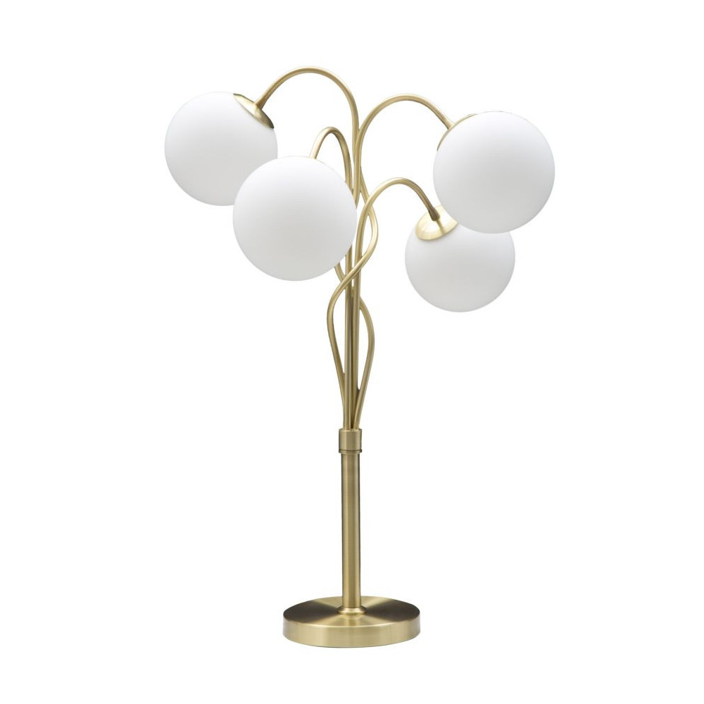 Lampada da tavolo 4 punti luce in metallo dorato con sfere in vetro opaco. Un grazioso intreccio ne caratterizza la forma. Lampade da terra, da tavolo e lampadari! Con le sue sfere e le sue finiture in oro la linea Glamy dona una luce soffusa e sicuramente glam alle tue stanze!