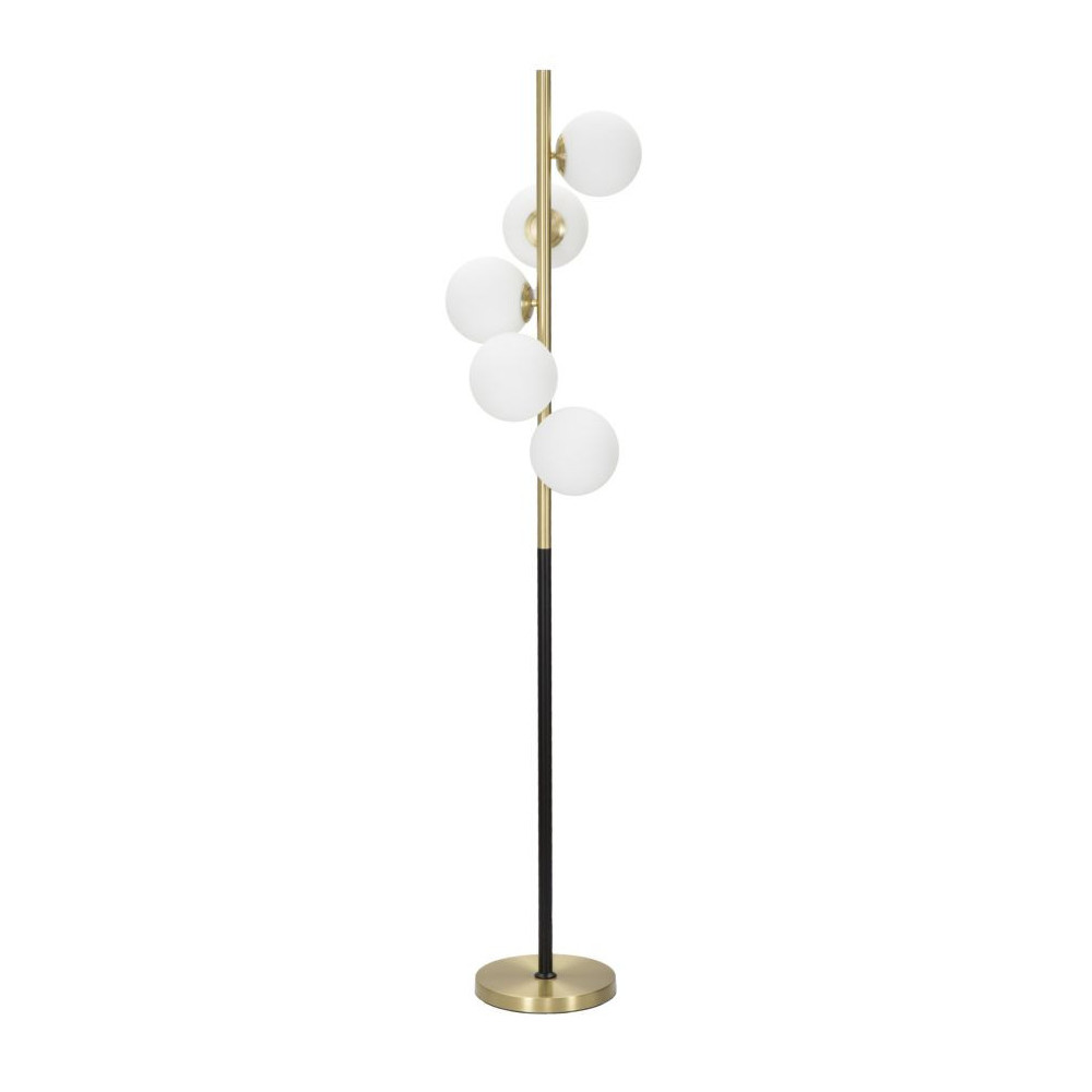 Piantana con 5 punti luce in metallo dorato e nero con sfere in vetro bianco. Le linee essenziali e minimali si sposano con l'eleganza dell'oro e del nero per creare una combinazione unica.