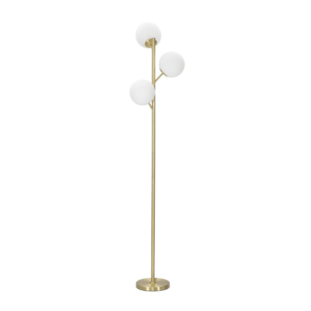 Piantana con 3 punti luce in metallo dorato con sfere in vetro bianco. Le linee essenziali e minimali si sposano con l'eleganza dell'oro per creare una combinazione unica.