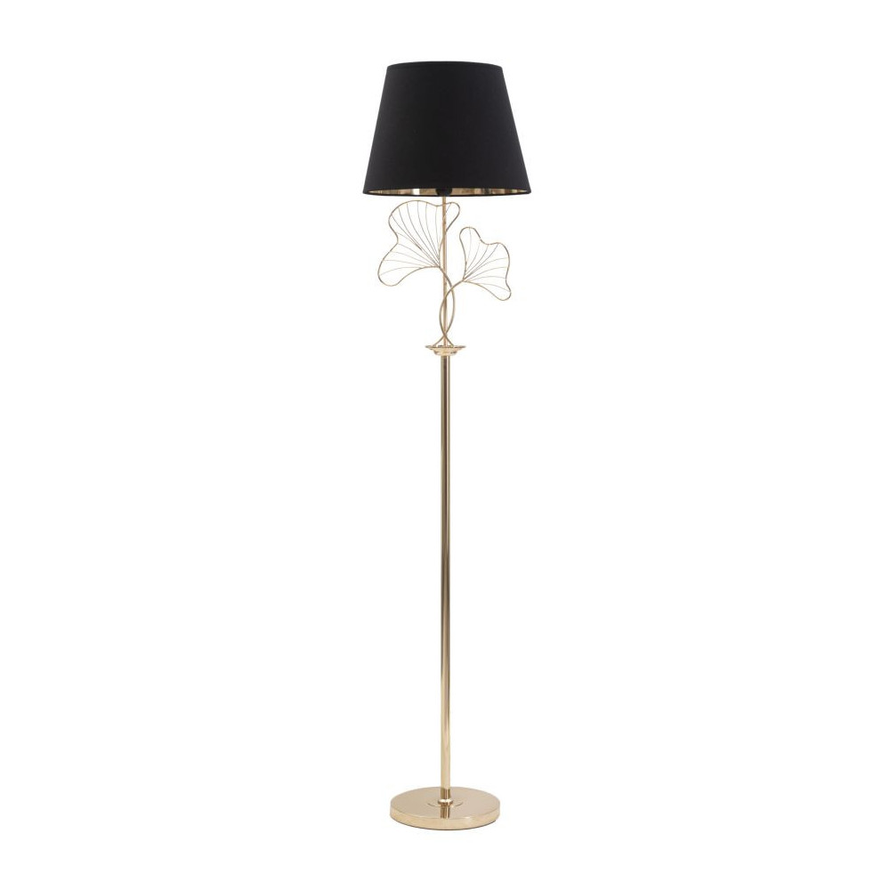 Piantana in metallo dorato con paralume in tessuto nero. L'elegante decorazione richiama delle foglie. L'unione tra l'oro e il nero creano un perfetto contrasto adatto ad ogni ambiente.