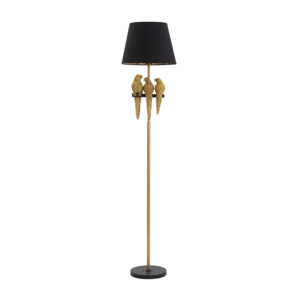 Piantana in metallo dorato con paralume in tessuto nero. L'asta è decorata con dei papagalli. L'unione tra l'oro e il nero creano un perfetto contrasto adatto ad ogni ambiente.