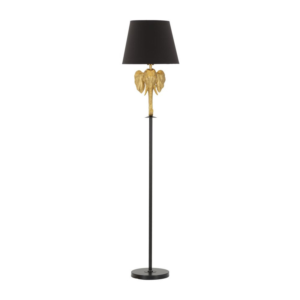 Piantana in metallo nero con testa di elefante dorato decorativo con parlume in tessuto nero.