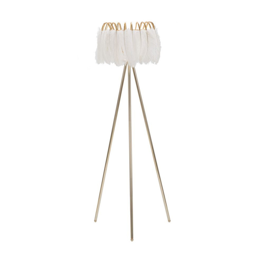 Piantana in metallo dorata formata da tre aste e paralume composto da piume bianche.
