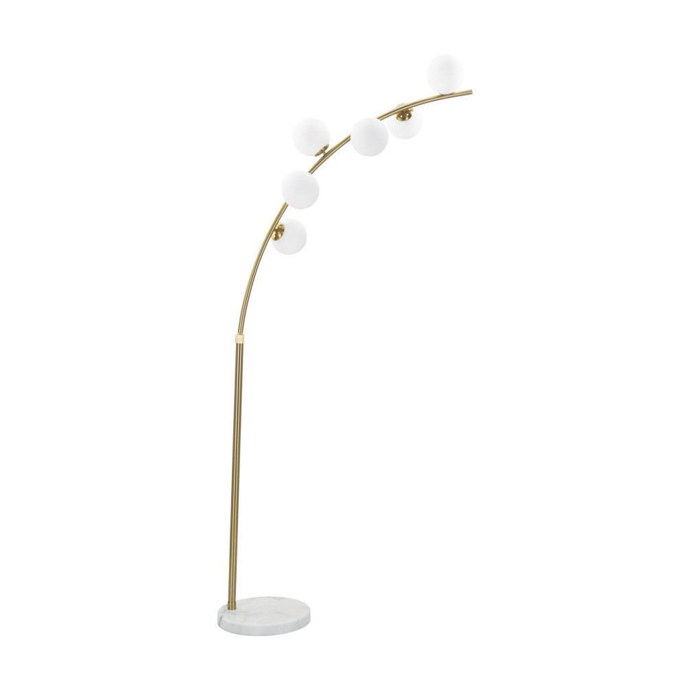 Piantana in metallo dorato con base in marmo dalla forma arquata. Completa di 6 punti luci in eleganti sfere di vetro bianco.
