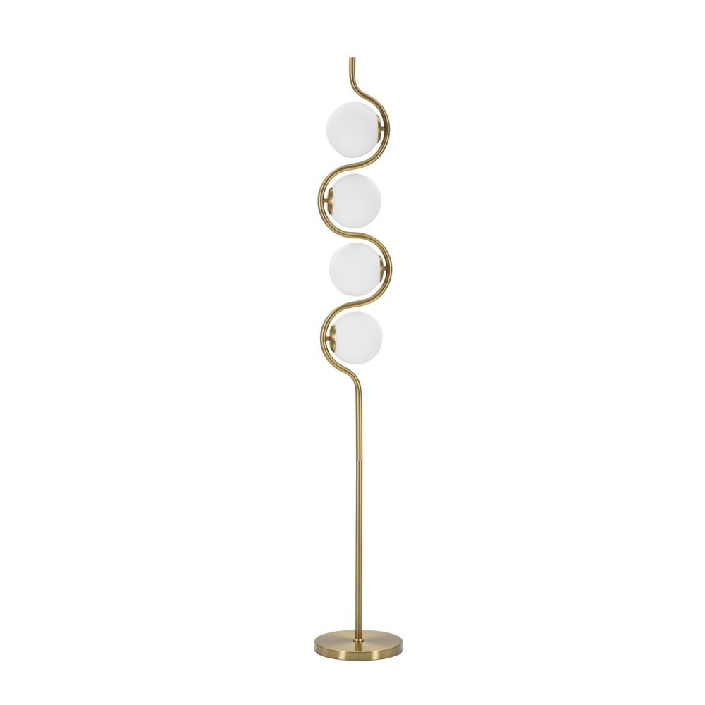 Piantana in metallo dorato dalle forme sinuose con 4 punti luci in eleganti sfere di vetro bianco.