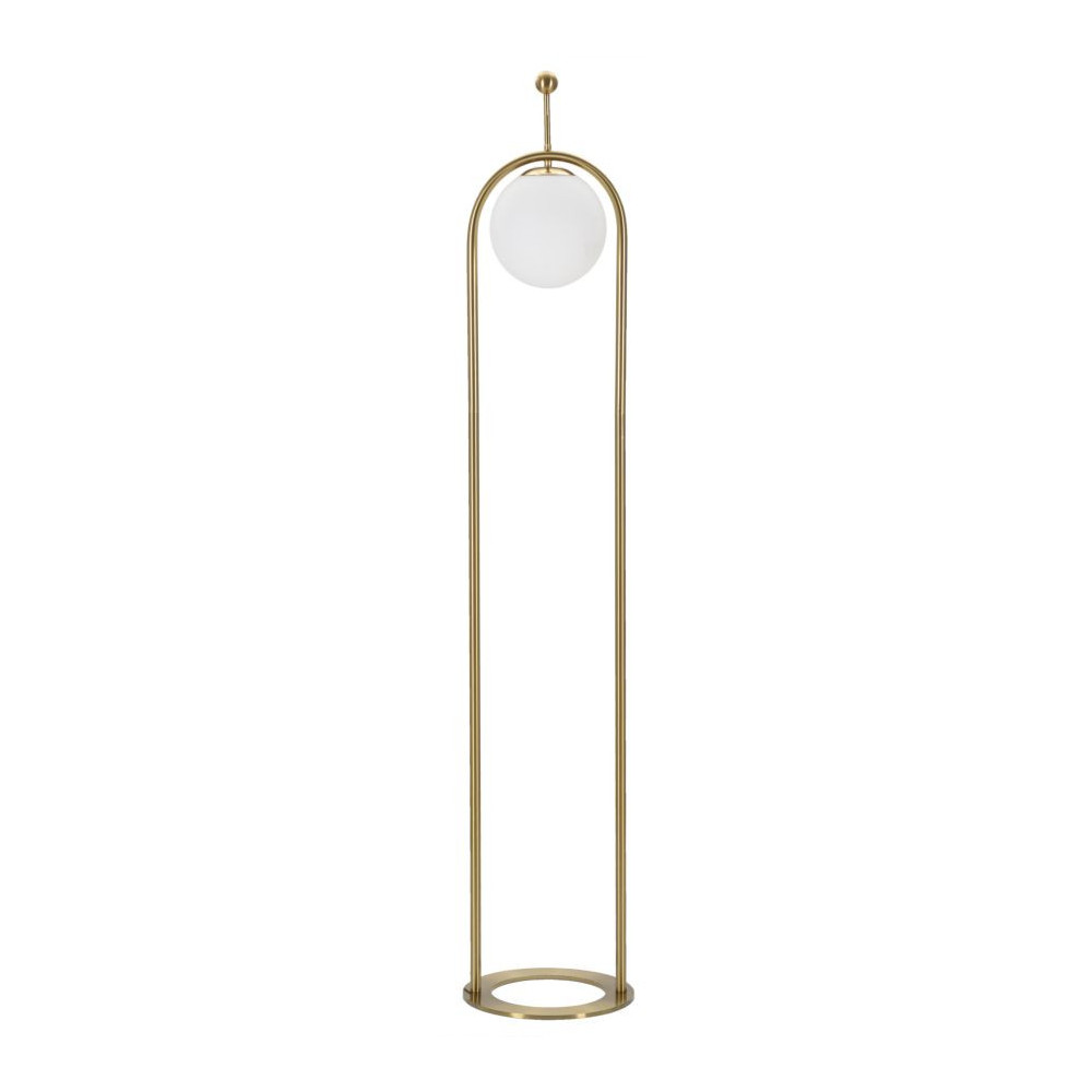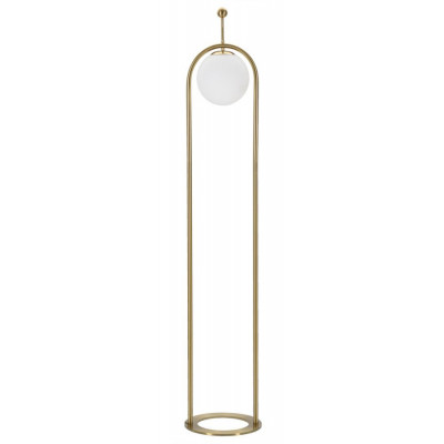 Piantana in metallo dorato dalle linee semplici con elegante sfera paralume in vetro bianco.