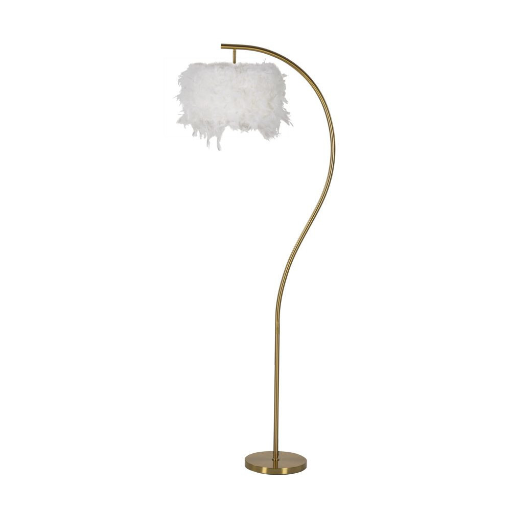 Lampada da tavolo in metallo dorato dal design arcuato e lineare completa di elegante paralume composto da piume sintetiche.