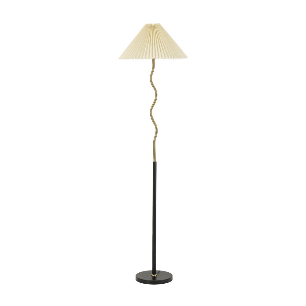 Lampada da terra in metallo nero e argentato dal design morbide e sinuoso. Completa di paralume in tessuto plissettato bianco.