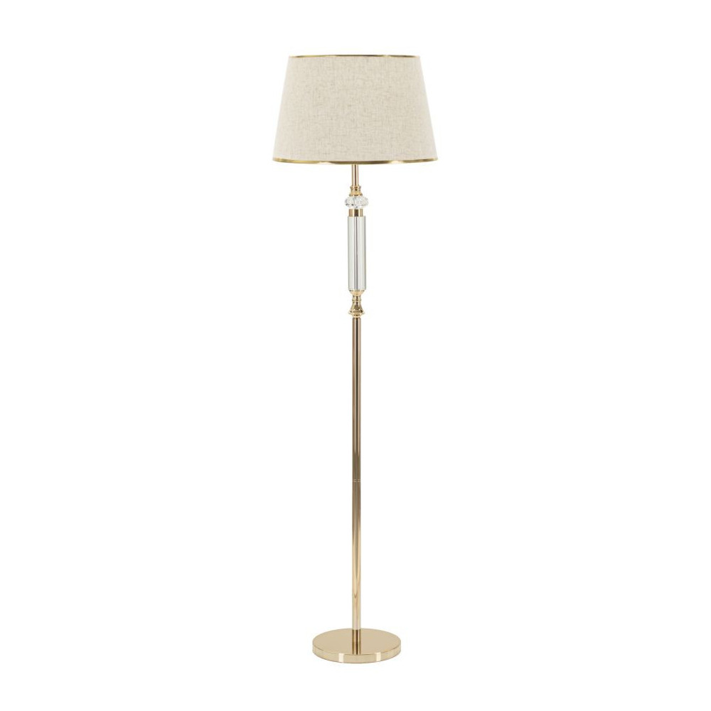 Elegante piantana in metallo dorato con applicazioni trasparenti. Completa di paralume in tessuto beige con finiture dorate.
